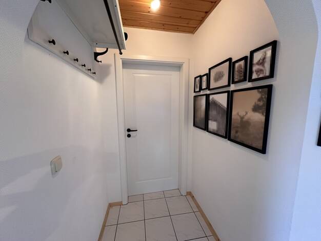 Eingangsbereich mit Diele, Garderobe und Gastherme, rechts Flur zu Schlafzimmer, Kinderzimmer und Tageslichtbad (Wanne, Dusche, WC, Waschtisch), großes, offenes und helles Wohn- und Esszimmer mit Süd...