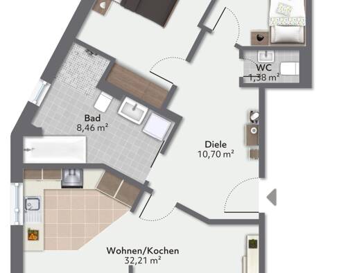- Wohnflächen: Wohnungen verfügen typischerweise über Größen von 64 - 109 m².