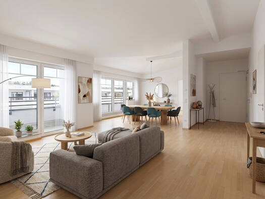 Dieses außergewöhnliche, barrierefreie Penthouse erstreckt sich über die gesamte Dachgeschossebene und vereint Privatsphäre mit lichtdurchfluteter Großzügigkeit in einem Wohnkonzept von zeitloser Ele...