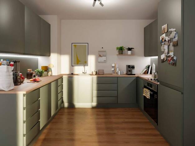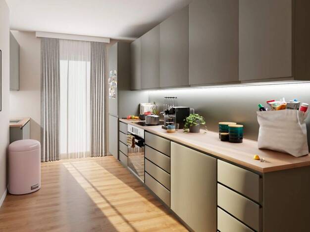 Duschbad mit Duschtrennwand und Tageslichtbad mit Badewanne Diese Wohnung schafft Raum für gemeinsames Leben und individuelle Rückzugsorte. Der offen gestaltete Wohnbereich mit Küche ist Mittelpunkt ...