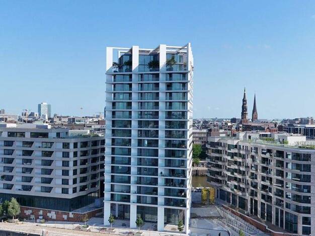 . Luxuswohnturm "FiftyNine Strandkai", ein architektonisches Highlight im Quartier Strandkai . Eine strahlende weiße "Perle", direkt an der Elbe gelegen . Repräsentativer Eingangsbereich im weißen Ma...