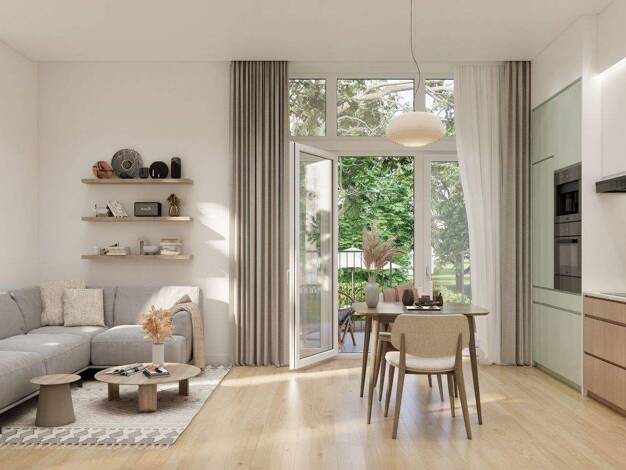Das Zentrum dieser hellen Wohnung im 1. Obergeschoss ist das großzügige Wohnzimmer mit bodentiefer Verglasung, die für ein helles, offenes Raumklima sorgt. Von hier aus ist der große, ruhig gelegene ...