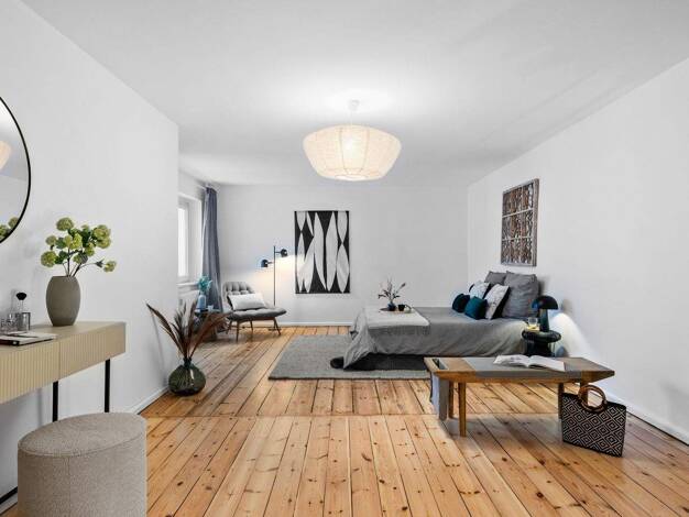 Herzlich willkommen in Ihrem neuen Zuhause. Der helle kombinierte Wohn- und Schlafbereich bietet ausreichend Platz für eine individuelle Möblierung und lässt sich flexibel in Wohnen, Schlafen und Arb...