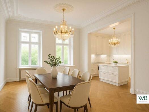 Die lichtdurchflutete Wohnung im dritten Obergeschoss erstreckt sich über die komplette Etage und verbindet die elegante Architektur der Gründerzeit mit durchdachter, zeitgemäßer Technik. Vom Wohn-/E...