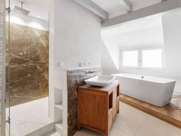 Hier vorgestellt wird die Wohnung 2.10 im Dachgeschoss von Haus 2, eine besonders repräsentative 3-Zimmer-Penthousewohnung mit ca. 120 m² Wohnfläche. Die Wohnung nimmt das gesamte Dachgeschoss ein, ü...