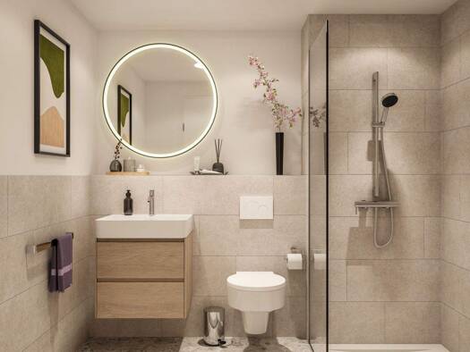 Diese barrierefreie Dachgeschosswohnung überzeugt durch das Pultdach mit einer Deckenhöhe bis zu 3,10 Meter sowie einem großzügigen Bad mit einem stilvollen Aufsatzwaschtisch und einer modernen Walk-...