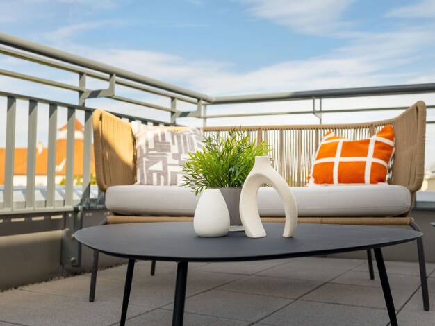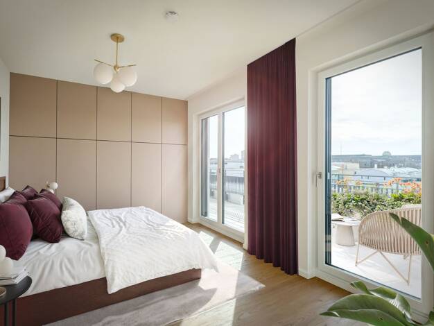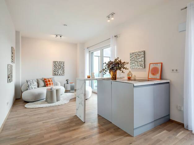Diese hochwertig ausgestattete 2-Zimmer-Wohnung im Dachgeschoss von Haus 4 überzeugt durch eine lichtdurchflutete Atmosphäre und eine großzügige West-Dachterrasse – ideal für lange Sonnenstunden am N...