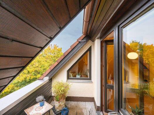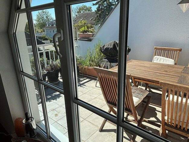 Die lichtdurchflutete, helle Dachgeschoss Maisonettewohnung mit bis zu 4,80 m hoher, offener Dachgalerie befindet sich in ruhiger Lage direkt am Stadtrand. Von der sonnigen, teilweise überdachten Dac...