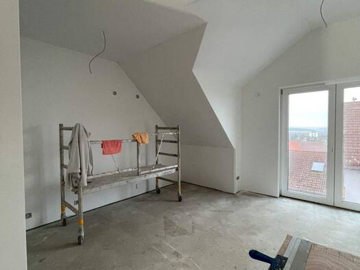Wohnung 5 (Dachgeschoss) Diese exklusive 3-Zimmer-Eigentumswohnung befindet sich im Dachgeschoss eines Sechsfamilienhauses im Effizienzhaus-40-Standard in begehrter Wohnlage von Petersberg. Die erhöh...