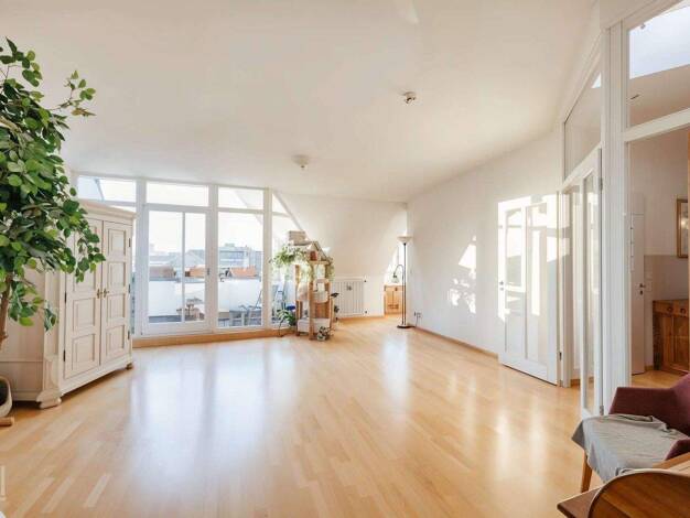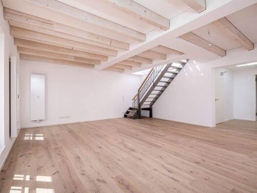 Der sorgfältig geplante Grundriss dieser ca. 135 m² großen Dachgeschosswohnung lässt viel Raum für Gemeinsamkeit, aber auch Rückzug. Stützen und freigelegte Holzbalken ermöglichen spannende Sichtachs...
