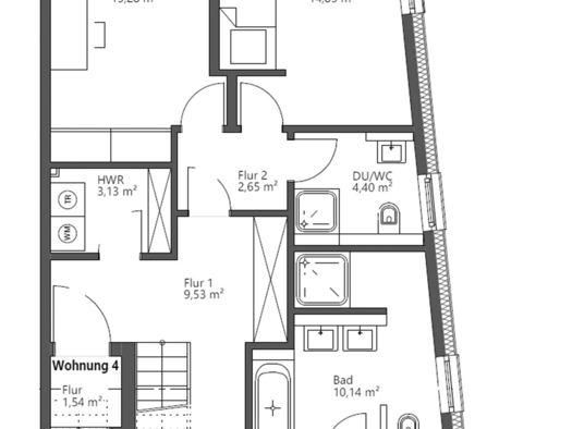 Die 149-m²-Obergeschosswohnung besteht aus vier Zimmern und drei Bädern bzw. WC, verteilt über zwei Geschosse und aus einer etwa 15 m² große Dachterrasse und einem Balkon. Zusätzlich ist ein Kellerra...