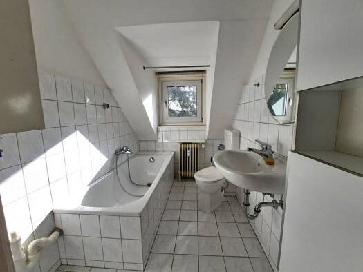 Die Wohnung befindet sich im Dachgeschoss eines frisch gestrichenem 20er Jahre Hauses. Die Ausrichtung des Wohnraumes und Schlafraumes sind nach Süden und Westen. Das charmante Badezimmer mit Badewan...