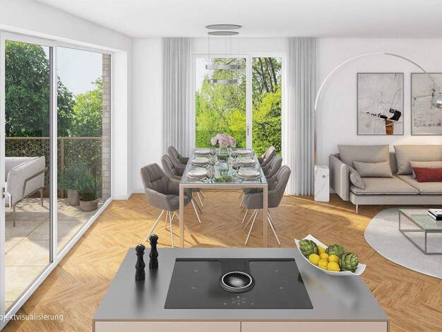 Bodentiefe Fenster sorgen für eine helle Wohnung, egal ob die Sonne scheint oder nicht. Ein großzügiges Wohnzimmer mit offener Einbauküche und einem großzügigen Wohn-Schlafzimmer mit Duschbad bilden ...
