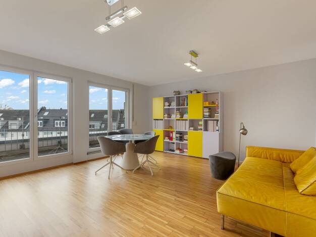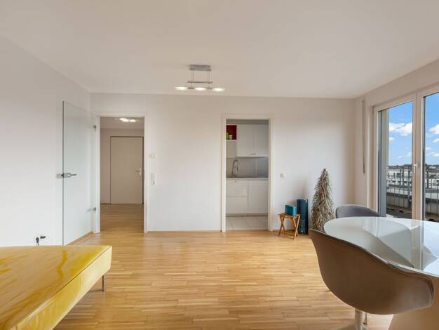 Über der Stadt. Bei sich. Zuhause. Es ist dieses Gefühl, wenn man aus dem Aufzug steigt - und ganz oben ankommt. Keine Wohnung darüber. Mehr Licht. Mehr Ruhe. Mehr Distanz. Der Wohn- und Essbereich b...
