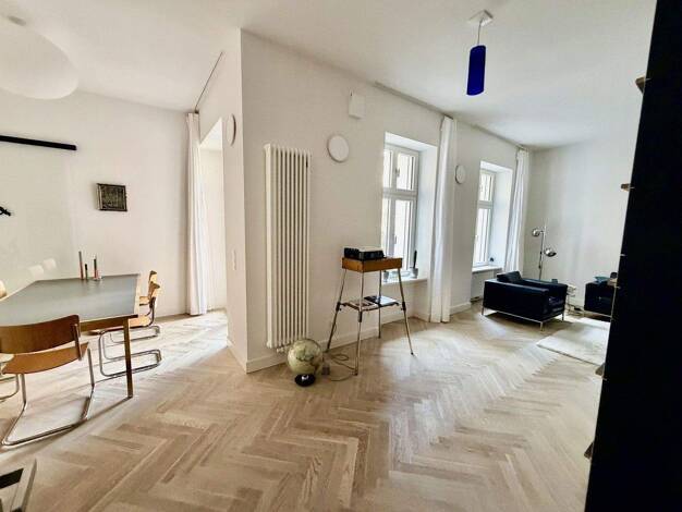 Diese charmante Erdgeschosswohnung im modernisierten Altbau von 1900 liegt ruhig im Innenhof und bietet auf ca. 49,42 m² zwei stilvoll eingerichtete Zimmer. Der offene Wohn-, Ess- und Kochbereich ist...