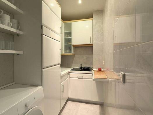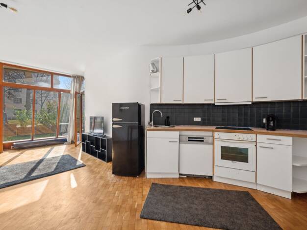Diese stilvoll eingerichtete Einzimmerwohnung im Erdgeschoss eines gepflegten Hauses mit Aufzug überzeugt durch eine helle Atmosphäre, eine durchdachte Raumaufteilung und ein zusätzliches Highlight: ...