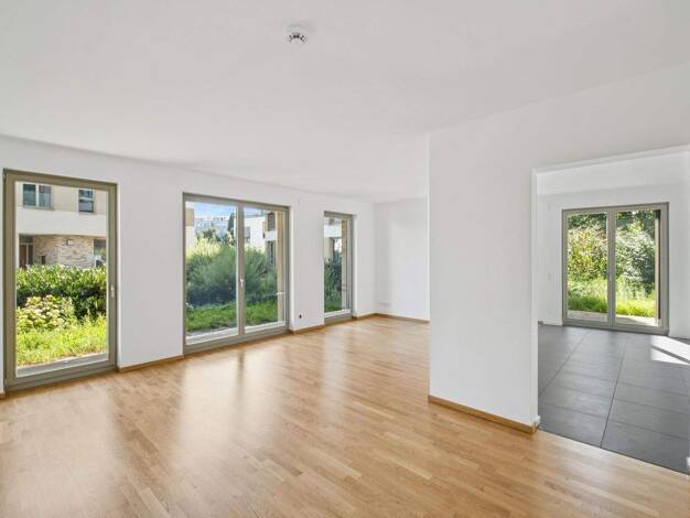 Ein "Haus-im-Haus" erwartet Sie bei dieser attraktiven 4-Zimmer-Wohnung mit ca. 410 m² Privatgarten (SNR) in ruhiger Lage. Wohnen Sie auf einer Ebene mit bodentiefen Fenstern zum Garten und in die Um...