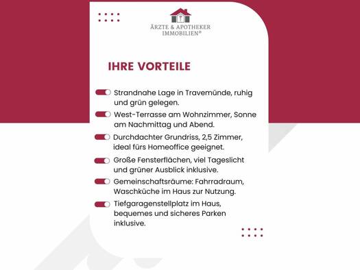 2 1/2-Zimmer-Eigentumswohnung, ca. 73 m² mit großer Sonnenterrasse Die von uns angebotene Wohnung befindet sich in exzellenter, strandnaher Lage im Kurviertel von Travemünde. Der Badestrand und die P...