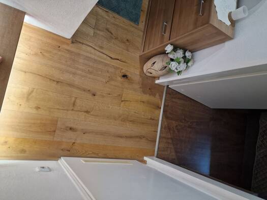 Geht man im 1.OG durch die Wohnungstüre, kommt man zuerst in den großzügigen Flur. Von da ab zweigen zur rechten Seite das lichtdurchflutete Badezimmer mit Badewanne, das Gäste-WC und die Speisekamme...