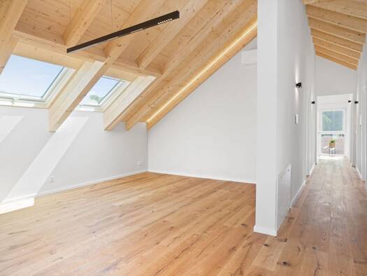 Studiocharakter, Sichtbalken und Dachterrasse - Wohnen für Designliebhaber Diese Dachgeschosswohnung ist ein echtes Unikat: komplett neu errichtet in ökologischer Holzständerbauweise, bietet sie ein ...