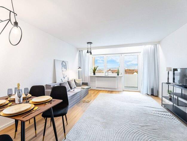 Die Wohnung beginnt mit einem kleinen Windfang, der sich hervorragend für eine Garderobe eignet. Dieser führt direkt in den lichtdurchfluteten offenen Wohn-/Essbereich mit Balkon und herrlichem Ausbl...