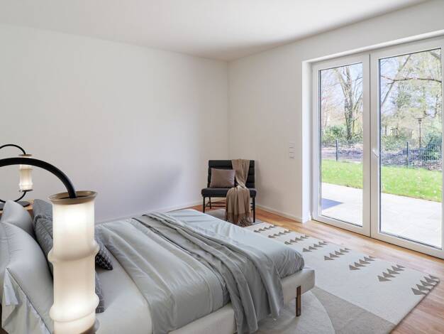 Barrierefreier Neubau (KfW-40, A+) direkt an den Laher Wiesen. Stilvolle 2-Zimmer-Gartenwohnung mit großzügigem Schnitt, Parkett, Fußbodenheizung, bodentiefen 3-fach-Fenstern und elektrischen Jalousi...
