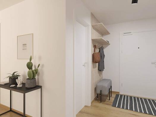 Mit bodentiefen Fenstern und einer sonnengeküssten Terrasse bleibt Ihr Zuhause stets hell und einladend. Treten Sie ein in Ihr neues Zuhause. Der Eingangsbereich führt Sie in einen großzügigen Flur, ...