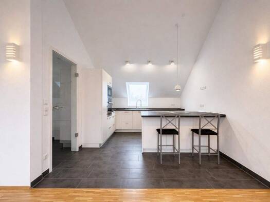 Stilvolle Dachgeschosswohnung mit Galerie Großzügiger Wohnbereich mit elektrisch steuerbaren Velux Dachfenstern mit Rollos. Einbauküche mit Granitplatte. Überdachter Balkon mit Glas-Lamellendach vers...