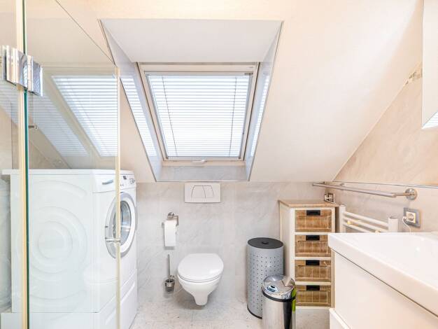 Diese exklusive Maisonette-Eigentumswohnung liegt im Dachgeschoss eines gepflegten Mehrfamilienhauses mit insgesamt sieben Einheiten. Das Haus, Baujahr 1988, teilt sich eine Tiefgarage mit dem Nachba...
