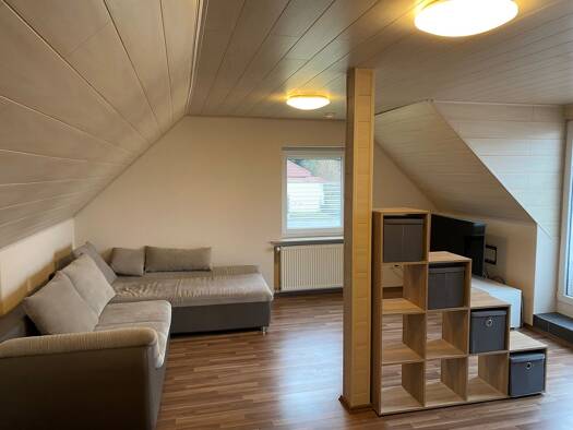 Die attraktive Maisonette liegt im 1. Obergeschoss und im Dachgeschoss eines Zweifamilienhauses am Waldrand des Ortes und bietet großzügiges und offenes Wohnen auf zwei Ebenen. Die offenen Balken und...