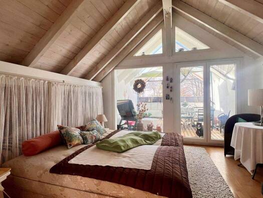 Diese besondere Maisonette-Wohnung verbindet historischen Charme mit moderner Architektur und richtet sich an Menschen, die das Außergewöhnliche suchen. Sichtbare Dachbalken, warme Holzdielen, eine o...