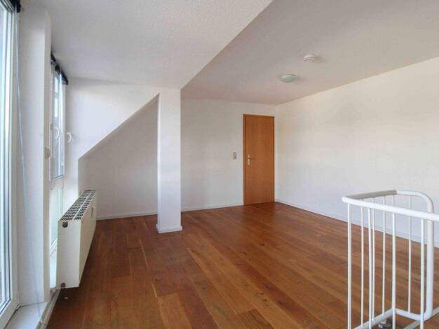 Nach Betreten der Maisonette-Wohnung gelangen Sie in den zentralen Flur, von welchem aus sich das Schlafzimmer sowie das Badezimmer (Ebene 1) sowie der Zugang zum Wohnbereich (Ebene 2) erschließen. D...