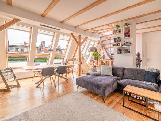 Die Wohnung befindet sich im Dachgeschoss eines um 1897 errichteten Altbaus. Der Ausbau des Dachgeschosses erfolgte 1993/1994. Die architektonisch äußerst eindrucksvolle Wohnung begeistert den Besuch...
