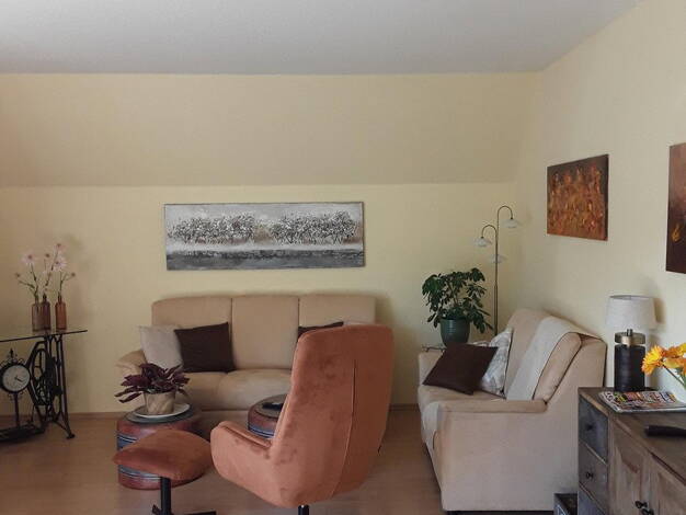 Aufteilung: Obergeschoss: Heller und großzügiger Wohn-/Essbereich mit Zugang zum Balkon, Küche, Diele, Gäste-WC, Flur und Zugang zum Dachgeschoss. Dachgeschoss: Schlafzimmer, Arbeitszimmer, Bad/Dusch...