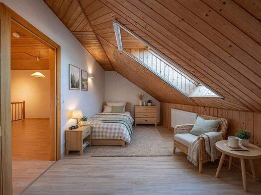 Diese großzügige Maisonette-Wohnung erstreckt sich über das Ober- und Dachgeschoss eines Gebäudeteils, der im Jahr 2000 in Massivbauweise als Anbau an ein ehemaliges Bauernhaus errichtet wurde. Auf c...