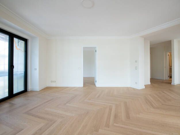 Morgens öffnet sich die raumhohe Schiebetür zum Wohnbereich, sanft gleitet das Licht über das edle Echtholzparkett, während die Fußbodenheizung für angenehme Wärme sorgt. Sie treten ans Fenster, blic...