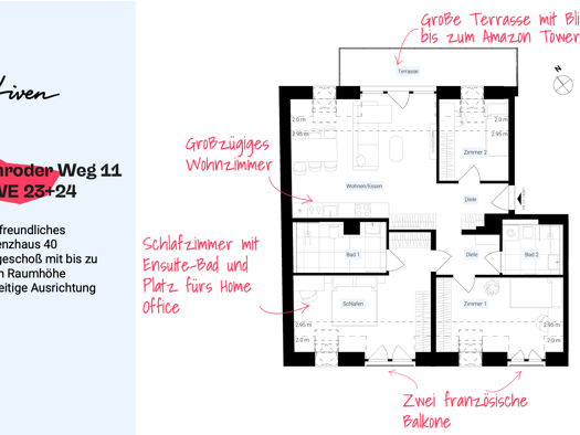 Großzügiges Dachgeschoss in klimafreundlichem Effizienzhaus 40 mit KfW-Förderung. Barrierefreie Penthouse-Wohnung mit großer Dachterrasse mit Weitblick bis zum Amazon-Tower. Hochwertige Ausstattung ...