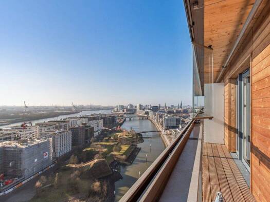 Freier Blick auf die Elbe und die Elbphilharmonie, eine umlaufende Terrasse und ein Neubau, der Offenheit und Privatsphäre perfekt vereint - diese Wohnung zählt zu den seltenen Angeboten der HafenCit...