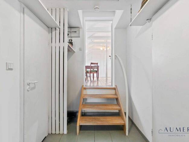 Der Eingang zum Wohngebäude wurde über Eck in das Haus zurückversetzt. Über 2 Stufen gelangen Sie in den Eingangsbereich der Wohnanlage. Nach Öffnen der Tür finden Sie einen großzügigen, hellen Gemei...