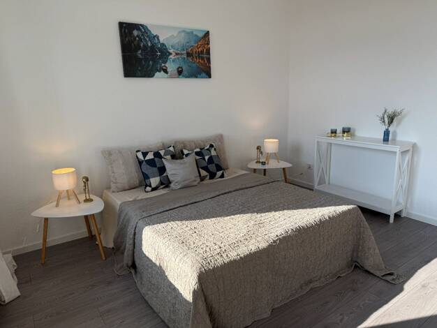 Diese Wohnung befindet sich in unmittelbarer Nähe zum Messegelände. Sie verfügt über drei Zimmer: ein großes Wohnzimmer sowie ein größeres und ein kleineres Schlafzimmer. Die kleine Küche hat einen d...