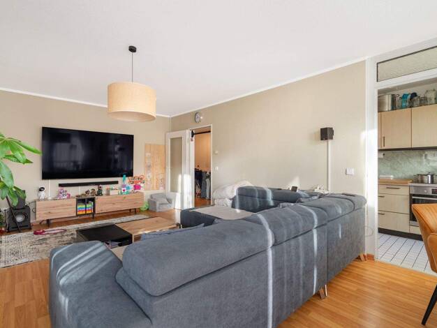 Man betritt die Wohnung über einen kleinen Flur, von dem aus alle anderen Räume abgehen. Das Wohnzimmer ist mit Laminat, Schlaf- und Kinderzimmer mit Teppich ausgestattet. Vom Wohnzimmer aus gelangt ...