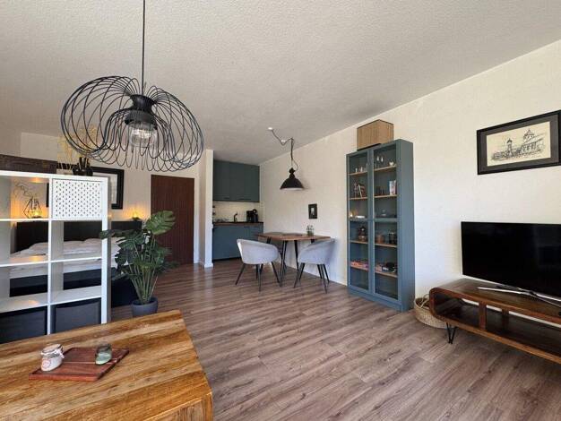 Objektbeschreibung Das möblierte Apartment mit einer WFL von 28 m² liegt im 2. OG eines Mehrfamilienhauses dass sich direkt an der Nordseeküste befindet. Wohn-Schlafbereich mit Sofa, Esstisch mit Stü...