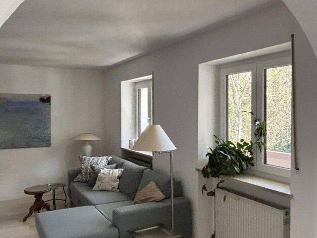 Die stilvolle Wohnung befindet sich im obersten Geschoss eines Mehrfamilienhauses (Baujahr 1984) mit 6 Wohneinheiten. Sie verfügt über 4 Balkone (2 Süd- und 2 Nordbalkone). - Wohn-/Esszimmer mit Kach...