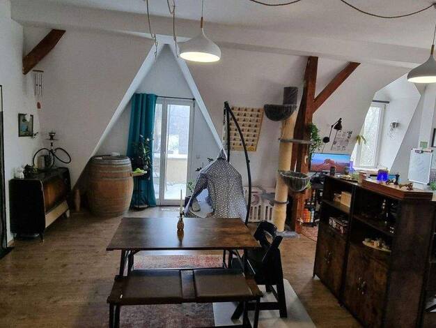 Das Gebäude wurde 1983 errichtet und beinhaltet drei Wohneinheiten. Die Wohnung befindet sich im Obergeschoss sowie im Dachgeschoss und ist bequem über das Treppenhaus zugäng...