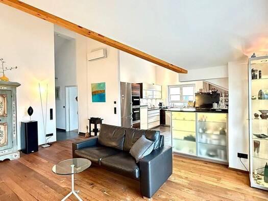Diese außergewöhnliche Dachgeschosswohnung begeistert durch ihre markante Architektur mit hochlaufenden, teils spitzen Dachflächen und schafft ein unvergleichliches Raumgefühl. Die besondere Dachform...