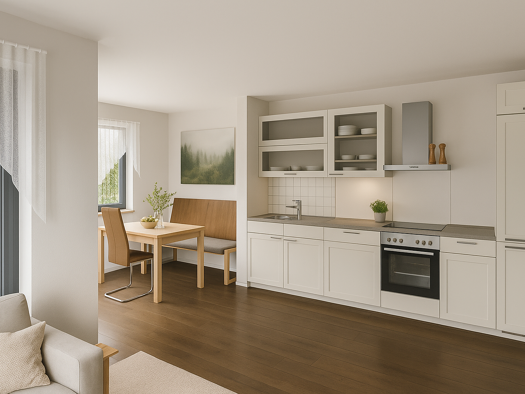 Das Apartment ist platzoptimiert. Im Eingangsbereich gibt es ausreichend Platz für eine Küchenzeile. Alle Räume und der Zugang zum Balkon sind barrierefrei. Das Bad ist barrierefrei, hat eine begehba...