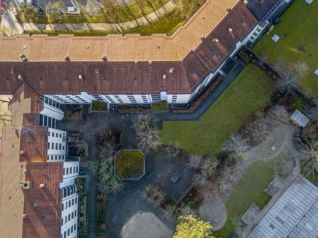 Ziemlich weit oben, im 4. Stock (von 5) genießt man den freien Blick in die grüne und ruhige Innenhof-Idylle. Das Vogelgezwitscher hört man vom Wohnzimmer und Balkon aus,- eben in diesem grünen Innen...