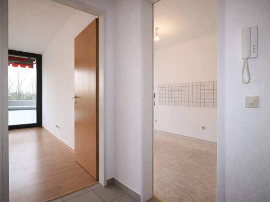 Die 2-Zimmer-Wohnung befindet sich in einem gepflegten Mehrfamilienhaus als Teil einer Wohnanlage mit insgesamt 6 Hauseingängen. Der Flur verbindet das Wohn-Esszimmer, das Schlafzimmer, das innenlieg...