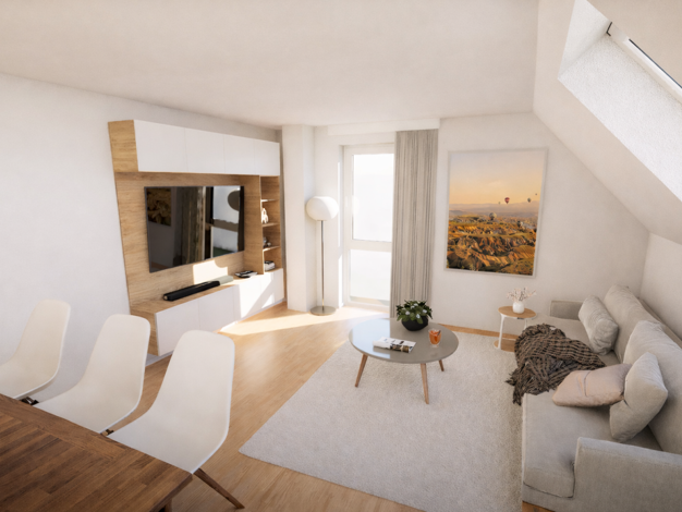 Zur Wohnung zählen 3 attraktive Zimmer. Vom Wohnzimmer aus gelangen Sie auf die großzügige Dachterrasse. Sie wählen Ihre Bodenbeläge selbst aus, ob Fertigparkett oder Fliesenboden. Küche/Essen und Wo...