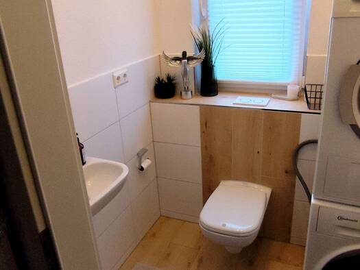 Die Wohnung (Nr. 2) im ersten Obergeschoss hat eine Wohnfläche von 109 Quadratmetern und besteht aus einem Flur, einem Gäste-WC, einem Schlafzimmer, einem Badezimmer mit WC, zwei Kinderzimmern, einem...